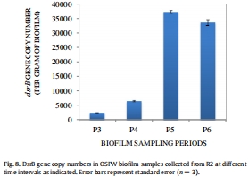 數據內容:DGGE圖譜顯示SRB的條帶數量隨運行時間增加;qPCR結果顯示dsrB基因拷貝數(即SRB豐度)在后期(P5, P6)約為前期(P3, P4)的五倍。