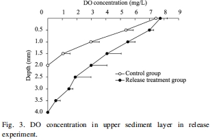 數(shù)據(jù)內(nèi)容:有藻組沉積物表層(1.5 mm深度)的DO濃度(4.08±0.97 mg/L)顯著高于無(wú)藻組(1.05±0.47 mg/L)。有藻組含氧層最大厚度約4.0 mm,無(wú)藻組約2.0 mm。