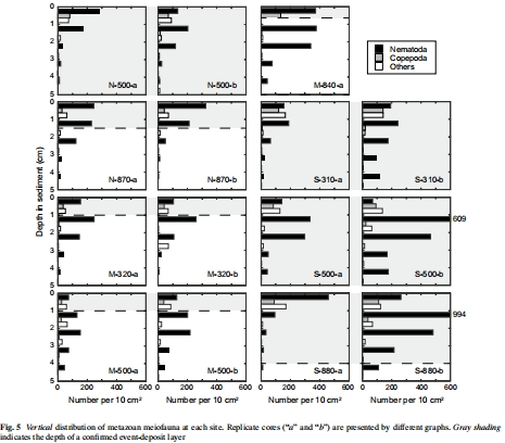 2011年東北大地震引發的沉積事件對底棲小型生物產生了持續至少一年的影響,表現為原核細胞和線蟲豐度在垂直分布上出現異常(亞表層峰值)。