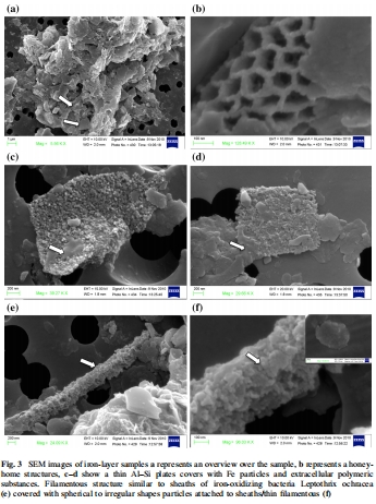 研究意義:提供了鐵層中存在類似鐵氧化細菌(如赭色纖毛菌 Leptothrix ochracea)鞘結構的形態學證據,表明微生物形態與鐵礦物沉淀密切相關。