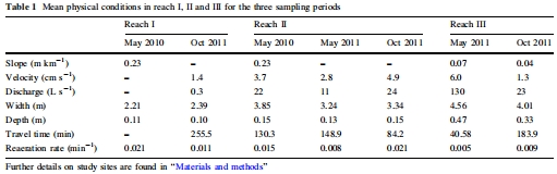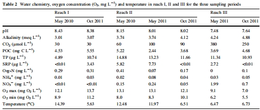 數(shù)據(jù)內(nèi)容:Reach I的NO??濃度低于檢測限,SRP濃度極低(<0.01-3.43 μg P/L);下游站點(diǎn)(Reach II, III)營養(yǎng)鹽濃度升高。溶解氧在Reach I和II接近飽和,在Reach III持續(xù)不飽和。
