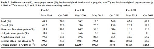 數(shù)據(jù)內(nèi)容:棲息地加權(quán)平均葉綠素a含量在Reach II最高(194-398 mg chl. a m?2),Reach I最低(32-100 mg chl. a m?2)。有機(jī)質(zhì)含量在Reach II最高(可達(dá)1221 g AFDM m?2)。
