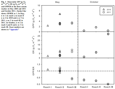 該論文研究了瑞典厄蘭島上三個營養(yǎng)貧乏的石灰質(zhì)河流的全程代謝。摘要指出,這些河流的初級生產(chǎn)力(GPP)普遍較低(<4 g O? m?2 d?1),其中最上游的站點(diǎn)由于土壤稀薄,GPP最低。生態(tài)系統(tǒng)呼吸(ER)隨農(nóng)業(yè)影響增加而顯著升高,導(dǎo)致下游出現(xiàn)異養(yǎng)條件。在營養(yǎng)最貧乏的站點(diǎn),日GPP與ER之間存在強(qiáng)相關(guān)關(guān)系。夜間瞬時呼吸速率在夜晚初期最高,但隨夜晚進(jìn)行而降低,表明暗呼吸消耗了光合產(chǎn)物并受有機(jī)底物限制。與歐洲西北部其他開放河流的比較顯示,春季夏季GPP與ER呈1:1關(guān)系,但冬季不成立。本研究將代謝測量范圍擴(kuò)展至營養(yǎng)貧乏的河流,增進(jìn)了對該區(qū)域河流代謝的理解,并證明了在從極營養(yǎng)貧乏到中等營養(yǎng)條件下,GPP與ER在春夏季節(jié)存在強(qiáng)關(guān)聯(lián)。