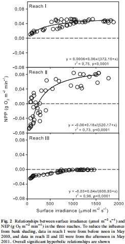 GPP與ER的耦合:在營養(yǎng)貧乏的站點(diǎn)(Reach I和II),日GPP與ER在春夏季節(jié)存在強(qiáng)正相關(guān)關(guān)系(接近1:1),表明白天生產(chǎn)與夜間呼吸緊密耦合。