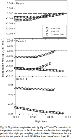 數(shù)據(jù)內(nèi)容:溫度校正后的瞬時呼吸速率在夜晚開始時最高,但在夜晚結(jié)束時下降,尤其在Reach I和II最為明顯。
