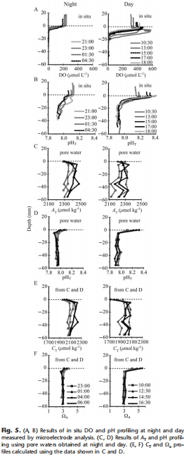 白天因底棲光合作用,DO和pH在2-9 mm出現峰值。