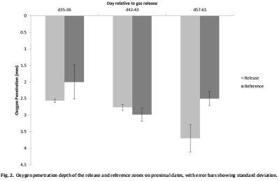 提供了沉積物代謝活動的直接指標:通過測量氧氣剖面并計算擴散性氧氣通量(圖3),研究獲得了評估沉積物有氧代謝強度的關鍵量化指標。泄漏區與參照區在此項數據上無顯著差異的結論,強有力地表明此次二氧化碳泄漏并未對沉積物中的有氧微生物活動(主要是有機質的好氧礦化)產生可測量的抑制或刺激效應。這為了解泄漏對底層生態系統核心功能(碳循環)的影響提供了直接證據。
