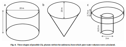模型估算的二氧化碳溶解量數據:研究人員構建了三種可能的二氧化碳在沉積物中遷移的幾何模型(圓柱體、圓錐體、漏斗形),結合測量的孔隙度、DIC差異等參數,估算了滯留于沉積物孔隙水中的二氧化碳質量。