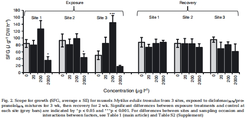 研究意義:SFG是衡量生物體健康和生產力的核心指標。SFG降低表明能量平衡被破壞,適合度下降;而SFG在某些條件下的異常升高可能是一種應激補償反應,而非健康改善。這些數據直接證明了藥物暴露對貽貝能量預算的顯著影響及其可恢復性。數據主要來自圖2。