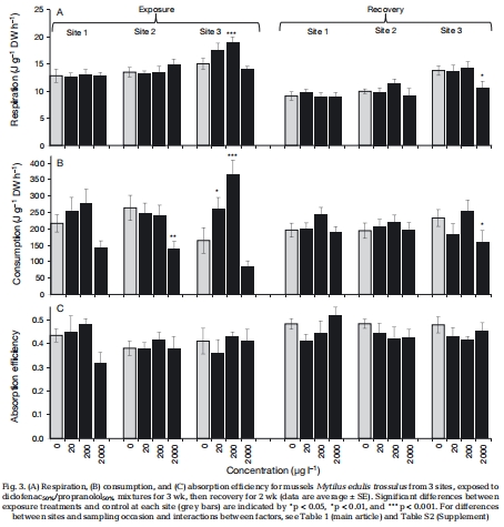 研究意義:這表明藥物暴露并未損害貽貝的消化系統功能,生理影響主要體現在攝食行為和代謝消耗上。數據來自圖3C和表1。