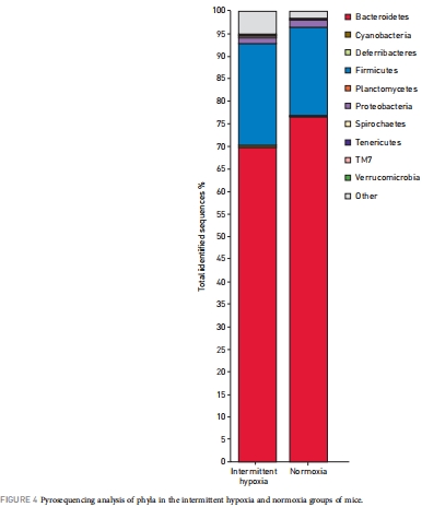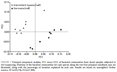 本研究評估了模擬阻塞性睡眠呼吸暫停(OSA)核心特征之一的間歇性低氧是否會改變小鼠模型的糞便微生物組。通過測量結腸糞便中的氧分壓(PaO2)并分析微生物組組成,研究發現間歇性低氧在腸道近上皮區域(<200μm)引發了低氧/再氧合事件,導致微生物組全局結構改變,包括α-多樣性(Shannon指數)增加和β-多樣性變化。具體而言,間歇性低氧暴露組小鼠的厚壁菌門(Firmicutes)豐度增加,而擬桿菌門(Bacteroidetes)和變形菌門(Proteobacteria)豐度減少。這表明間歇性低氧可能通過改變腸道微生物組,影響OSA相關的生理互作。