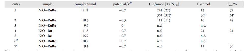 表1、采用不同材料制成的電極材料進行光電化學還原二氧化碳的效率。其中的d表示的是沒有光照環境,e指的是體系中的氣體環境是氬氣。從表中可以看出,只有選擇NiO-RuRe陰極材料時,在進行光電化學還原二氧化碳效率最好,而選用單獨的NiO-Ru和NiO-Re陰極材料時,其光電催化還原二氧化碳的效率不好。