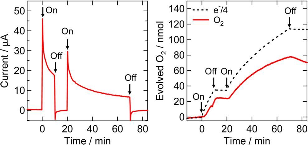 圖4、左邊的圖表示的是陰極為NiO-RuRe陽極為CoOx/TaON的混合光電化學的電流隨時間的變化情況。右邊的圖表示的是電解水溶液中的氧氣濃度隨時間的變化情況分析,其中的紅線表示的是氧氣濃度的變化,虛線表示的是體系中生成的電子的隨時間的變化情況分析。