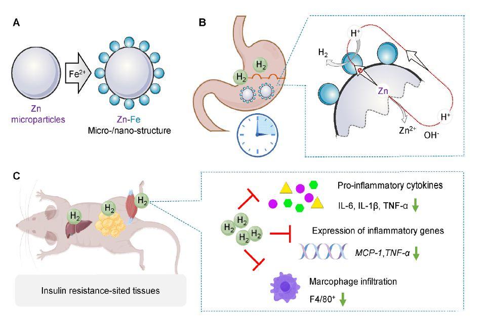 圖1、Zn-Fe原電池微納米結(jié)構(gòu)的結(jié)構(gòu)和構(gòu)建方法示意圖(A)、加速Zn水解和H2產(chǎn)生的原電池原理(B)、胰島素中H2的高效積累口服Zn-Fe給藥后抵抗部位的組織支持增強(qiáng)抗炎和改善胰島素耐受性(C)。