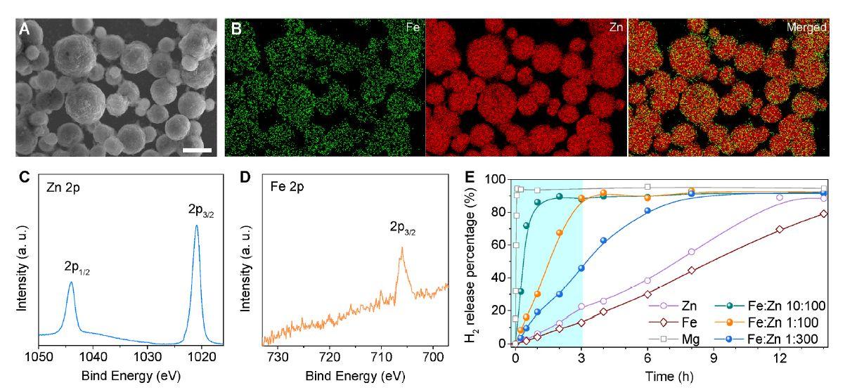 圖2、Zn-Fe微/納米顆粒的代表性SEM圖像(A)和相應(yīng)的EDS元素圖(B)、Zn-Fe微/納米顆粒的XPS譜(C,D)以及Mg、Fe的酸響應(yīng)H 2生成曲線、Zn和Zn-Fe微/納米顆粒在模擬胃酸溶液中具有不同的Fe/Zn比(E)。圖A中的比例尺對(duì)應(yīng)于5μm。
