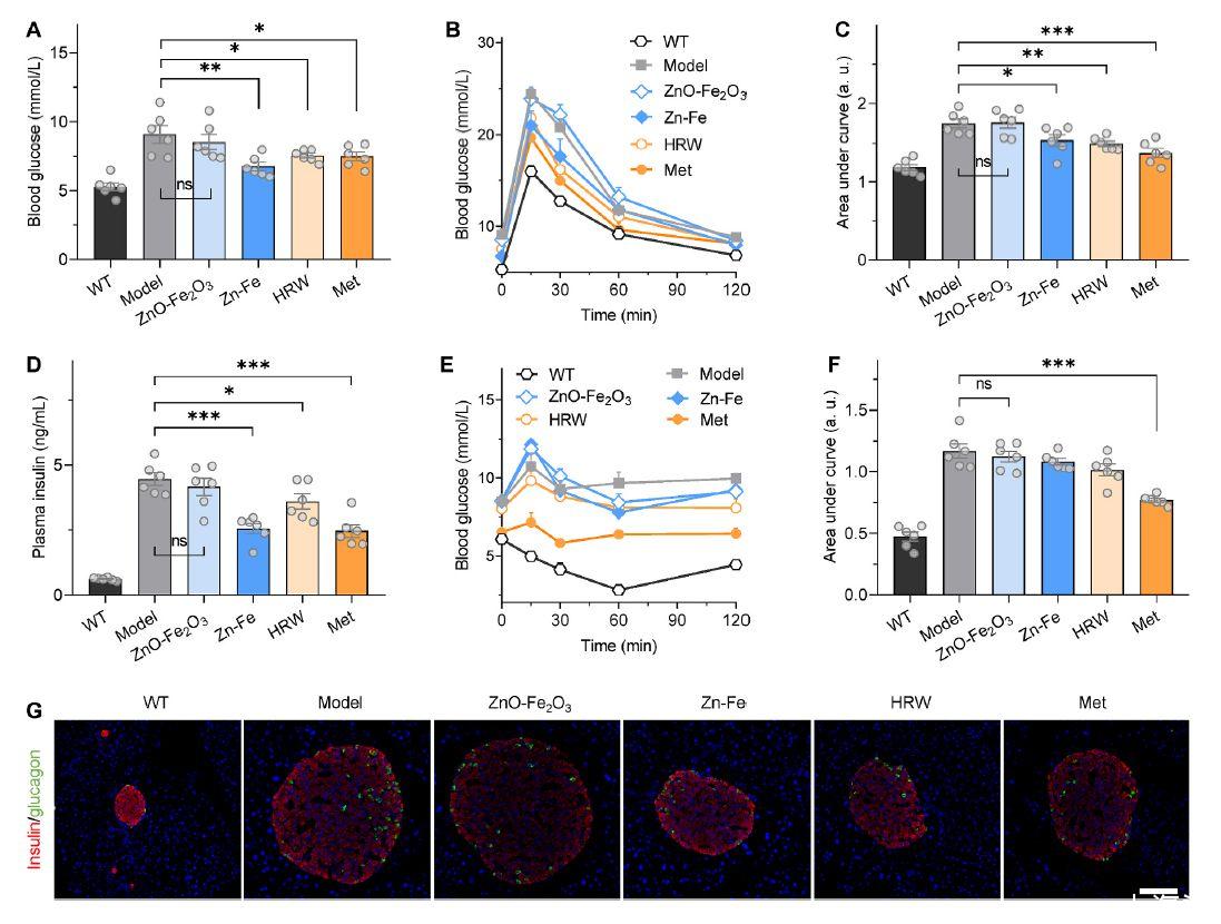研究簡(jiǎn)介:2型糖尿病(T2D)作為全球嚴(yán)重健康問(wèn)題,預(yù)計(jì)到2030年將有4.39億人患病。T2D與肥胖密切相關(guān),其中胰島素抵抗(IR)是肥胖相關(guān)T2D進(jìn)展的常見(jiàn)原因之一,主要通過(guò)慢性全身性炎癥引起。傳統(tǒng)治療方法包括生活方式干預(yù)和藥物管理,但存在持續(xù)堅(jiān)持的難題。目前的藥物主要包括二甲雙胍(Met)和吡格列酮,但由于其副作用,長(zhǎng)期使用效果有限。因此迫切需要開(kāi)發(fā)安全有效的新型抗胰島素抵抗技術(shù)。本研究指出氫分子(H2)是一種安全、有效且廣譜的抗炎劑,對(duì)許多炎癥相關(guān)疾病具有益處。盡管口服富含氫的水(HRW)已被證實(shí)可以改善T2D患者和動(dòng)物模型的葡萄糖代謝,但水中溶解的氫量較低。為增強(qiáng)氫的傳遞效率,研究探討了固態(tài)氫供體的開(kāi)發(fā),如金屬氫化物、硼化物和硅化物。然而,現(xiàn)有的口服劑仍存在釋放速率難以控制的問(wèn)題。為應(yīng)對(duì)這一挑戰(zhàn),研究人員提出了一種主電池策略,構(gòu)建了Zn-Fe微/納米結(jié)構(gòu),實(shí)現(xiàn)了酸響應(yīng)的可控氫釋放。實(shí)驗(yàn)結(jié)果表明,Zn-Fe在胃中產(chǎn)生的氫可以有效積聚在肝臟、脂肪組織和骨骼肌等主要IR部位,為一種新的抗胰島素抵抗治療策略提供了可能性。研究的創(chuàng)新點(diǎn)包括新型氫釋放策略、定向釋放和積累、Zn-Fe微/納米結(jié)構(gòu)設(shè)計(jì)以及對(duì)肥胖相關(guān)糖尿病的有效治療。整體而言,這項(xiàng)研究為氫療法的未來(lái)發(fā)展提供了新的方向和潛在的治療途徑。
