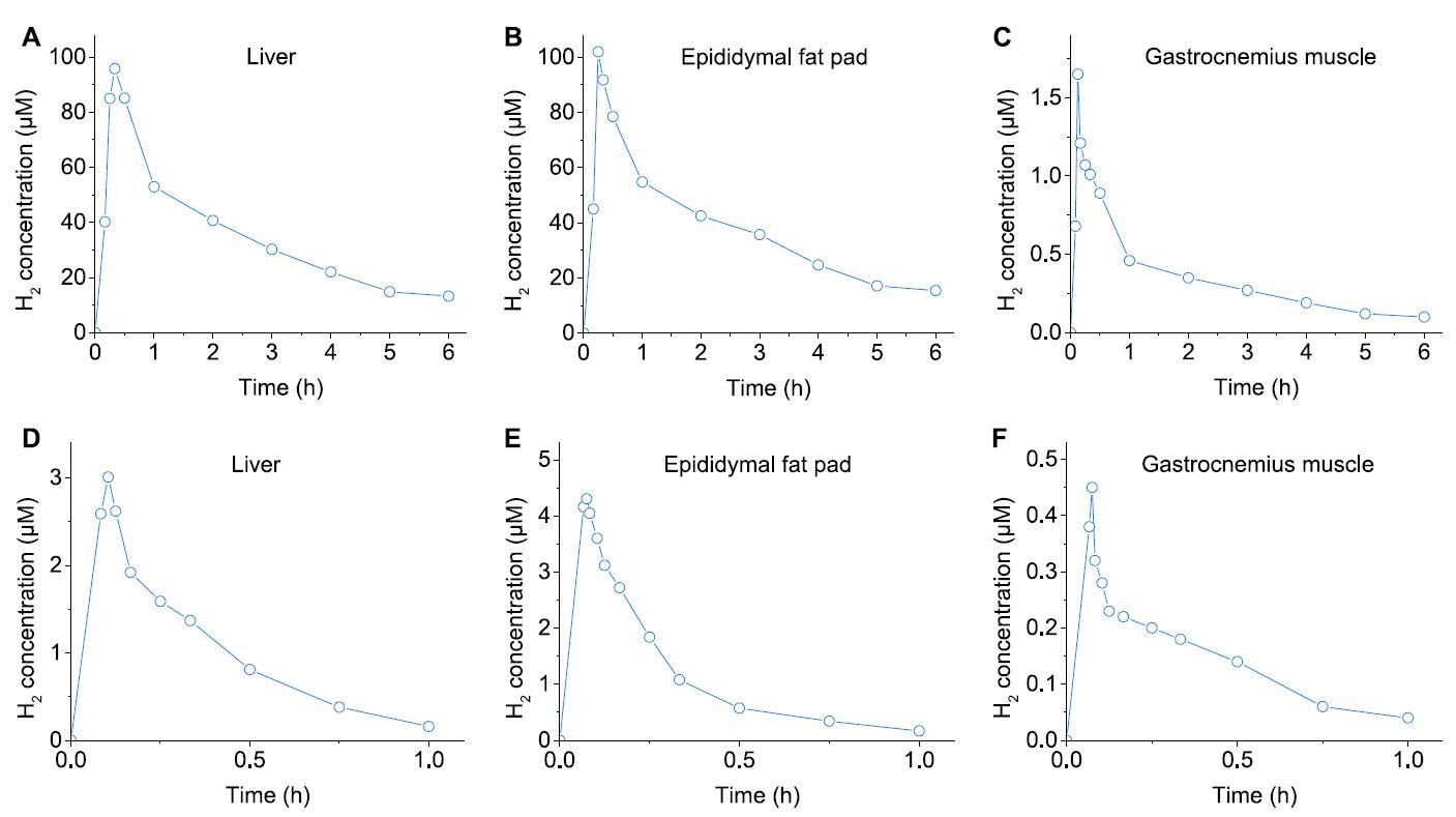 6至8周齡雄性野生型(WT)C57BL/6J小鼠以0.1 mL的劑量灌胃施用Zn-Fe(20 mg/mL,水溶液)或HRW(0.8 mmol/LH 2,水溶液)/10克體重(BW)(相當(dāng)于Zn-Fe 200 mg/kg BW)。通過(guò)Clark型H 2傳感器(Unisense,丹麥)實(shí)時(shí)監(jiān)測(cè)肝臟、脂肪組織(附睪脂肪墊)和骨骼肌(腓腸肌)中的H2濃度。