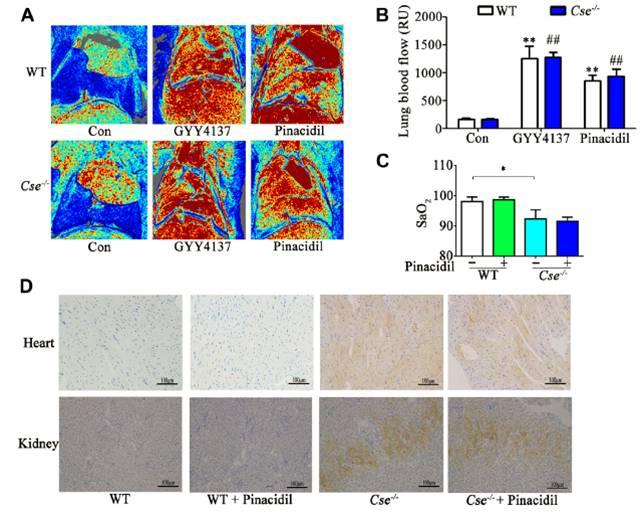 圖3、肺血流量增加不影響SaO2和腎臟和心臟組織缺氧。(A),肺血流的代表性LDI分析。(B),小鼠肺血流量的累積數據。(C),用鹽水或匹那地爾處理的WT和Cse-/-小鼠中的SaO2水平。(D),WT和Cse-/-小鼠心臟和腎臟中Hypoxyprobe信號的代表性圖像,用鹽水或匹那地爾處理。