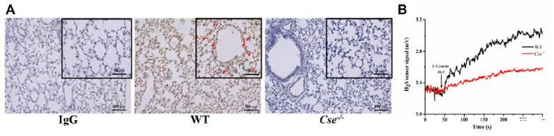 圖4、WT和Cse-/-小鼠肺組織中的CSE表達定位和H2S產生。(A),通過免疫細胞化學分析WT和Cse-/-小鼠肺組織中的CSE表達。WT和Cse-/-小鼠肺組織中CSE表達的代表性圖像。箭頭表示CSE陽性染色。(B),WT和Cse-/-小鼠肺組織中H2S的產生率。黑色痕跡,WT小鼠肺組織勻漿中H2S產生的代表性痕跡。紅色痕跡,代表痕跡Cse-/-小鼠肺組織勻漿中的H2S產量。
