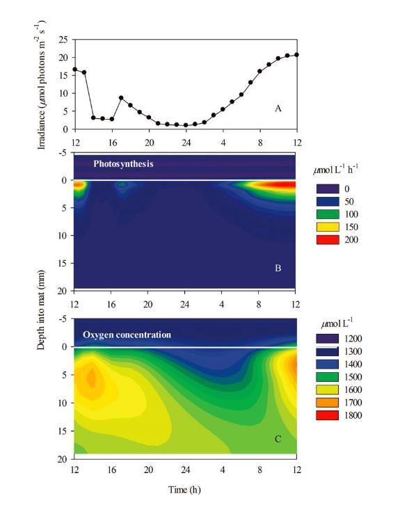 (A)Hoare湖近中午至午夜兩個時間序列中微生物墊中溶解氧濃度(mmolL-1)的輻照度(B,C)等值線圖。微生物藻墊-水界面處用白線表示