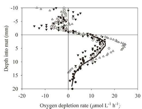 (A)氧通量與時間的關系;(B)輻照度與氧通量的關系。來自6個時間序列的數據被組合在一起,每個數據集使用不同的符號表示。