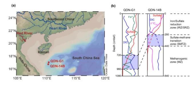 研究對(duì)南海北部?jī)蓚€(gè)重力巖心進(jìn)行了定量和同位素分析,以確定沉積FeR-OC的去向。QDN-G1為典型的陸坡沉積(1478 m水深),而QDN-14B(1370 m水深)位于QDN-G1西南約35 km處,受附近冷滲漏排出的富甲烷流體影響。因此,QDN-14B可用于比較評(píng)價(jià)在發(fā)生硫酸鹽還原耦合有機(jī)質(zhì)再礦化或甲烷氧化的成巖活動(dòng)區(qū),微生物活動(dòng)對(duì)FeR-OC潛在再活化的影響。同時(shí),利用微生物活性相對(duì)較低的沉積物組成的QDN-G1巖心,建立了覆蓋過(guò)去97 kyr的年齡模型,探索冰期-間冰期時(shí)間尺度上FeR-OC的長(zhǎng)期保存情況。