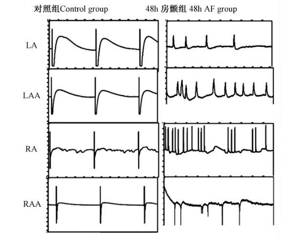 無論是對照組還是AF組均為RAA比LAA電壓高,且AF組LAA和RAA的電壓較對照組明顯降低。鑒于在體時右耳的解剖位置靠右、后、上,右房右耳較早除極,心臟整體的除極方向和其自身除極的方向一致,在心電向量圖上也表現為環體向前向下,而在心電圖的機理上也有右房大表現為P波的電壓增高,說明右房大小和P波呈正相關。而LAA除極方向幾乎和除極方向垂直,故其更大程度表現為時限,而不表現為電壓。正常左房除極向量方向是指向左后偏下,LAA為左右心房最終除極的部位,而心臟的整體除極方向為左前下,LAA更多反映心房最終除極時限,因此在對照組犬的LAA比RAA電壓小。而在48 h AF組,由于高右房局灶激動,形成折返,造成左右房顫動樣傳導,由于每個單個的折返環小,電壓低,且方向不一,在同一個方向上形成大的合力,故造成AF組LAA和RAA的較對照組電壓降低。