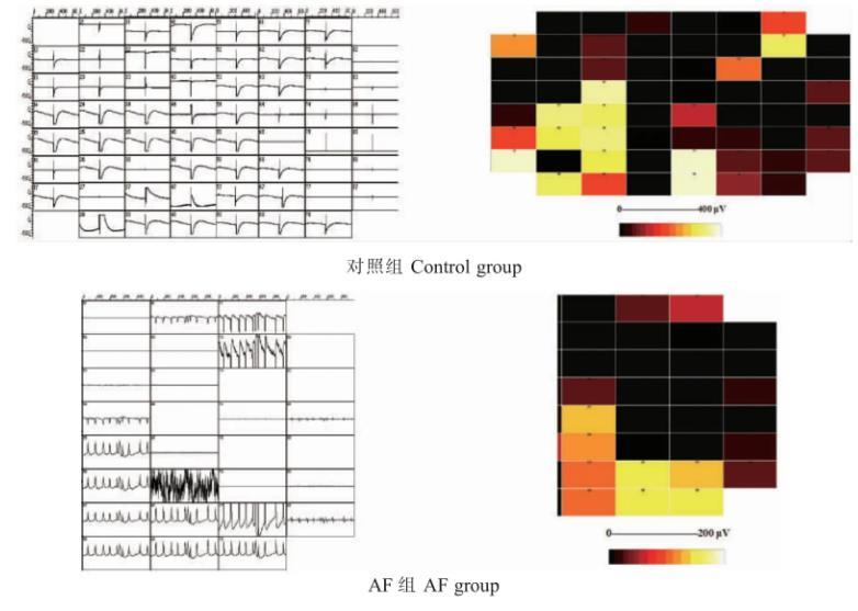 從左下至右、至右上的同步記錄心電信號中記錄到波形變化明顯的心耳肌組織塊早、中和晚的場電位信號,表明了電激動的傳導順序。可見對照組LAA的電激動傳導大致從左下角向右向上緩慢而遞減傳導,電壓逐漸減小,呈梯度改變。48 h AF組LAA電激動的場電位原始圖,可見激動頻率明顯增加并紊亂,節律絕對不齊,場電位信號在傳導過程中,電壓發生明顯的改變,電壓梯度樣改變消失,呈高低不等改變,表明電激動傳導方向不一致,電壓互相抵消導致電壓梯度樣改變消失(圖6,彩插5)。