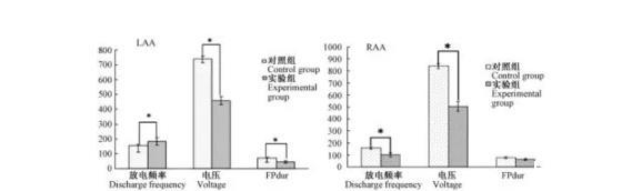 圖5對照組和實驗組LAA和RAA放電頻率,電壓和Fpdur的比較Note:Compared with the control group,*P<0.05,**P<0.01