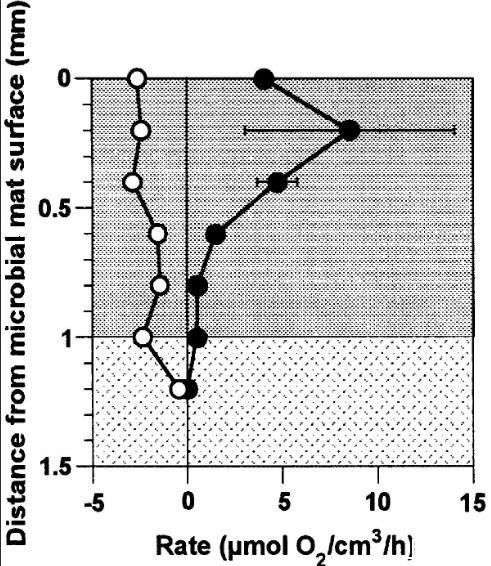圖5、在點1的沉積物中的平均總光合速率(填充圓圈)和計算得到的O2呼吸速率(開放圓圈)的剖面,在1900 mmol photons/m2/s的光強度下。誤差條代表測量的標準偏差。正值和負值分別表示O2產生和O2呼吸速率。微生物墊表面在深度為0毫米處。微生物墊和沉積物分別用灰色區域和虛線區域表示。