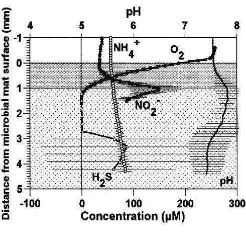 圖3、在點1的沉積物中的O2、NH4+、NO2、H2S和pH的平均穩態濃度剖面。O2濃度是在10 mmol-photons/m2/s的光強度下測量的。誤差條代表測量的標準偏差。微生物墊表面在深度為0毫米處。微生物墊和沉積物分別用灰色區域和虛線區域表示。
