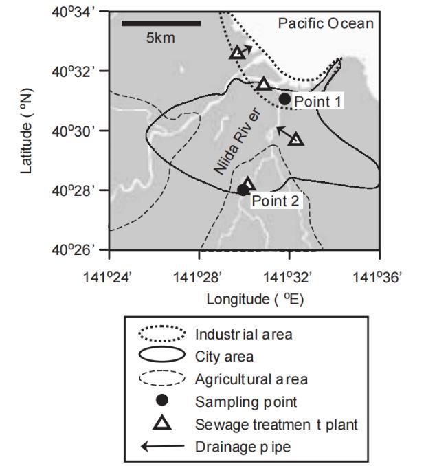圖1、顯示了日本八戶市新井田河中采樣點(點1和點2)的地圖。
