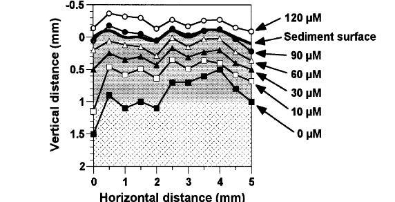 圖2、在點1的沉積物中的垂直截面中O2濃度的代表性二維等值圖。O2濃度是在10 mmol-photons/m2/s的光強度下測量的。右邊邊緣的數字表示O2濃度。通過顯微觀察確定的微生物墊表面用一條線表示。微生物墊和沉積物分別用灰色區域和虛線區域表示。