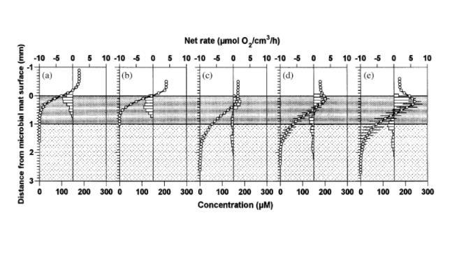 圖4、在點1的沉積物中的平均穩態O2濃度剖面(開放圓圈)和計算得到的凈氧產生和消耗速率(柱狀圖)。O2濃度是在10(A)、400(B)、1050(C)、1550(D)和1900(E)mmol photons/m2/s的光強度下測量的。誤差條代表測量的標準偏差。正值和負值分別表示氧氣產生和消耗速率。微生物墊表面在深度為0毫米處。微生物墊和沉積物分別用灰色區域和虛線區域表示。