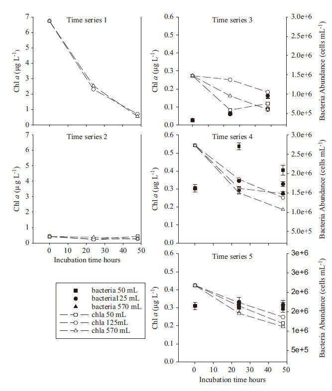 圖2.不同時間序列實(shí)驗(yàn)中的葉綠素a濃度和細(xì)菌豐度。