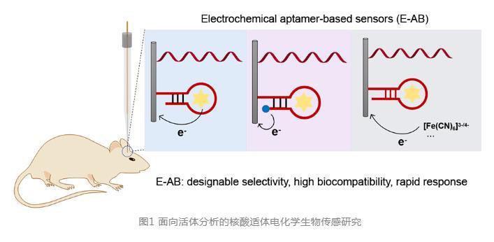 通過合理設計和調節碳纖維兩端的電化學反應,該類傳感可用于未來多種神經化學物質的活體在線監測。近期,得益于生物識別元件的不斷發展,尤其是核酸適體親和配體研究的迅速發展,面向活體層次的高選擇性電化學生物傳感研究迎來了新的機遇。北京師范大學江迎課題組綜述核酸適體電化學生物傳感器(Electrochemical aptamer-based sensor,E-AB)的設計原理,以及其活體分析化學應用進展,并對其未來發展趨勢進行展望。
