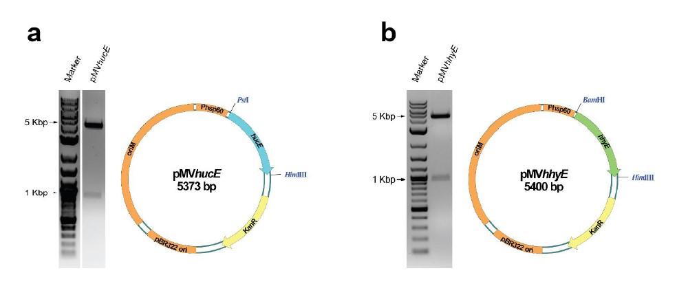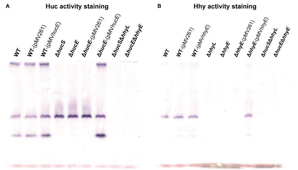 圖3、恥垢分枝桿菌野生型、衍生突變株和互補突變株中的氫化酶活性染色。全細胞裂解物用于在富含H 2的氣氛中以硝基藍四唑作為人工電子受體對H 2攝取進行酶譜染色。(A)野生型、ΔhucS、ΔhucE、ΔhucSΔhhyL、ΔhucEΔhhyE、以及互補的ΔhucE和野生型恥垢分枝桿菌(帶有空pMV261或互補載體pMV hucE)培養物的Huc活性染色)在早期穩定期(OD max~3.0后24小時)收獲。(B)野生型、ΔhhyL、ΔhhyE、ΔhucSΔhhyL、ΔhucEΔhhyE和互補的ΔhhyE和野生型恥垢分枝桿菌(帶有空pMV261或互補載體pMV hhyE)培養物的Hhy活性染色)在中期穩定期(OD max~3.0后72小時)收獲。
