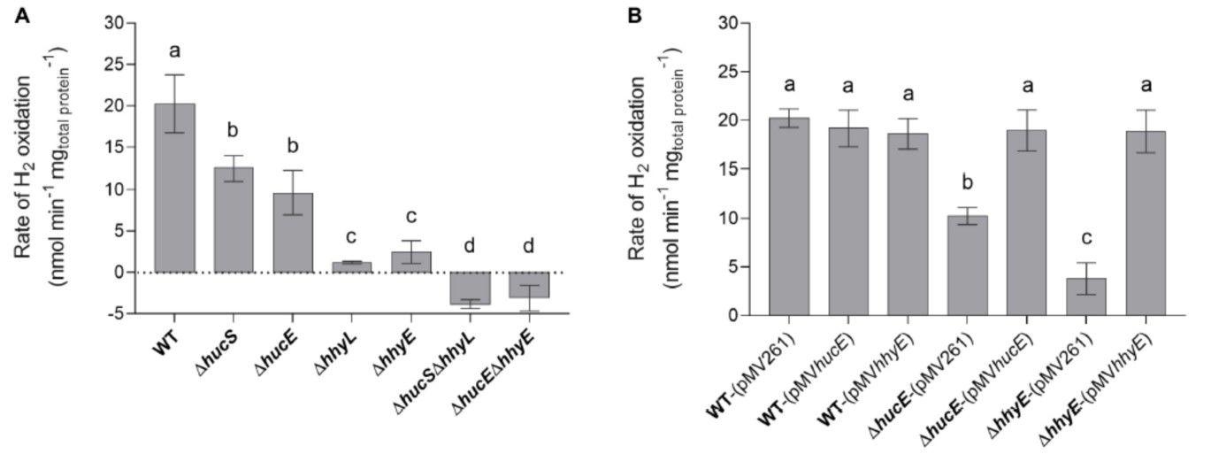 圖2、恥垢分枝桿菌。野生型、衍生突變體和互補突變株的氫氧化。使用Unisense微呼吸H2電極通過電流分析法測量整個細胞在中期穩定期(OD max~3.0后72小時)對H 2的吸收。(A)鐵硫蛋白野生型、單突變體和雙突變體(ΔhucE、ΔhhyE、ΔhucEΔhhyE)以及氫化酶結構亞基單突變體和雙突變體(ΔhhyE)之間H 2氧化速率的比較hucS,ΔhhyL,ΔhucSΔhhyL)。(B)分別用hucE和hhyE的表達補充的ΔhucE和ΔhhyE菌株中的H 2氧化速率。對照包括用空載體pMV261轉化的野生型、ΔhucE和ΔhhyE菌株以及用互補載體pMV hucE和pMV hhyE轉化的野生型菌株。