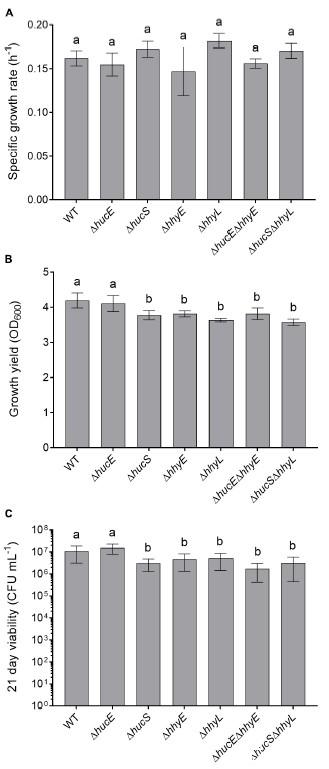 圖4、恥垢分枝桿菌。野生型和突變株的生長和存活率比較。七個菌株在補充有Tween80(LBT)的溶源肉湯中生長:鐵硫蛋白的野生型、單突變體和雙突變體(ΔhucE、ΔhhyE、ΔhucEΔhhyE),以及氫化酶結構亞基的單突變體和雙突變體ΔhucS,ΔhhyL,ΔhucSΔhhyL)。(A)指數期的特定生長率(μ)。(B)穩定期后24小時的最終生長產量(OD max)。(C)穩定期后21天的長期存活率(CFUmL–1)。