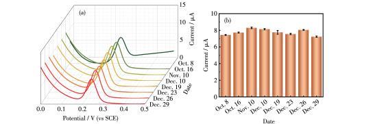 圖10以10μmol·L-1尿酸為模型的長期穩定性:(a)不同日期記錄的DPV曲線、(b)氧化峰的峰電流