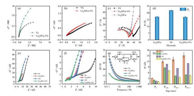 為了研究Cu2O/Cu‐VG微電極的電化學和生理電雙模性能,先分析了Ta、Cu2O/Cu、VG及Cu2O/Cu‐VG微電極在電化學反應動力學研究中常用的5.0mmol·L-1 K3[Fe(CN)6]/K4[Fe(CN)6]混合溶液中的反應動力學特性,并進一步探討了這些微電極在手背皮膚以及受腦電影響的頭皮區域的阻抗特征(圖2)。對于Nyquist圖,高頻區與實軸的交點為半電池體系的總內阻(Rs),高頻區的半圓直徑與電極、電解質之間的界面電荷轉移電阻(Rct)有關,半圓直徑越大,表明Rct值越大,而低頻區的直線段反映了離子的擴散效應。在[Fe(CN)6]3-/[Fe(CN)6]4-探針溶液里,Rs為8.26~9.36Ω。此外,Ta微絲表現了金屬電阻特性,Cu2O/Cu微電極則呈現金屬局部腐蝕電極特性(圖2a);而在VG和Cu2O/Cu‐VG微電極的阻抗譜上觀察到了半無限擴散特征(圖2b)。如圖2c和2d所示,Cu2O/Cu‐VG微電極的Rct最低,該值為23.74Ω,表示在液-固界面可以快速傳輸電子,這與擴散傳質有關。4種微電極在手背上均表現了擴散傳質特性,但阻抗大幅增加了(圖2e和2f)。
