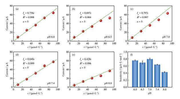 圖7 pH值對尿酸響應的影響:(a~e)尿酸濃度和峰電流的線性關系、(f)尿酸靈敏度