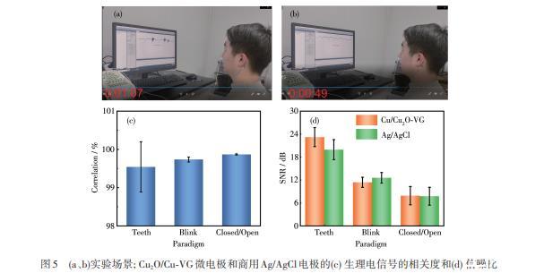 圖5(a、b)實驗場景;Cu2O/Cu‐VG微電極和商用Ag/AgCl電極的(c)生理電信號的相關度和(d)信噪比
