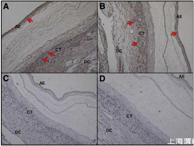 圖1、γ-半胱氨酸合成酶(CSE)和β-半胱氨酸合成酶(CBS)在人胎膜中的定位。A和B:免疫組化分析顯示CSE(A)和CBS(B)陽性染色的代表性切片。C和D:使用一抗得到的陰性對照切片被過量的相應肽預吸收。箭頭表示陽性染色。原始放大倍數,200(A-D)。AE:羊膜上皮;CT:絨毛滋養層;DC:蛻膜。