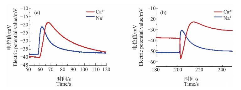 圖 3 未經冷凍處理(a)與經冷凍處理(b)的蘆薈原生質體破裂時形成的 Ca2+、Na+脈沖信號