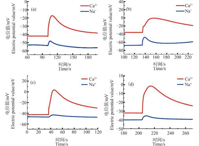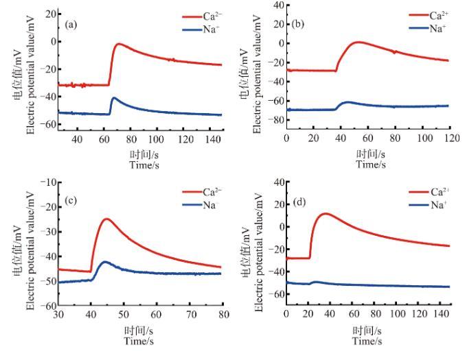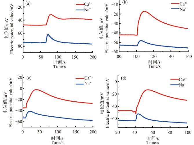 圖8不同濃度的ZnO NPs處理3 h后的蘆薈原生質體破裂時的Ca2+、Na+濃度脈沖注:(a)~(d)中ZnO NPs濃度分別為30、50、70和90 mg·L-1。