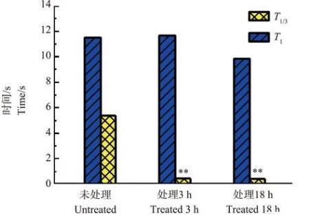 圖10未處理、ZnO NPs處理3和18 h的Ca2+濃度脈沖上升部分時間T1和T1/3