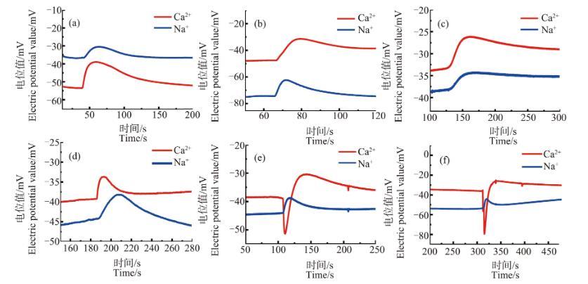 圖4不同冷凍溫度下原生質體破裂時的Ca2+、Na+濃度脈沖圖注:(a)~(f)溫度分別為18℃、10℃、0℃、-5℃、-7℃和-10℃。