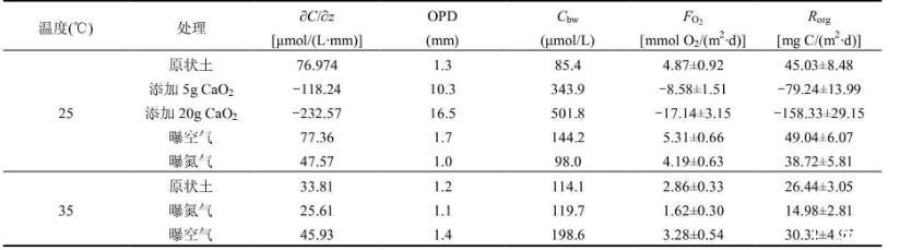 從表2結果來看,在增加水體氧氣供給的條件下,水體與沉積物間溶解氧交換過程加快,溶解氧交換通量由(4.87±0.92)增加至(5.31±0.66)mmol O2/(m2·d)交換速率提升9%,在升高溫度的情況下,氧氣交換速率加快,氧氣交換速率增加15%,溫度效應明顯。如果采用表層沉積物注射化學復氧措施,沉積物氧氣交換速率提升則更為顯著,從對照的4.87分別提升至8.58和17.14mmol O2/(m2·d),氧氣交換通量提升76%和252%.在重要的敏感水體,可考慮表層沉積物注射CaO2的方法應急處置水體黑臭現象。然而在水體缺氧甚至厭氧的狀況下,則其溶解氧的交換過程放緩,兩種溫度下均下降15%左右。水體曝空氣或化學復氧導致底層水體溶解氧與表層沉積物間濃度梯度增大,溶解氧源源不斷地被傳輸到沉積物中被迅速消耗掉,這可能是導致溶解氧在富氧條件下氧氣加速的主要驅動力。