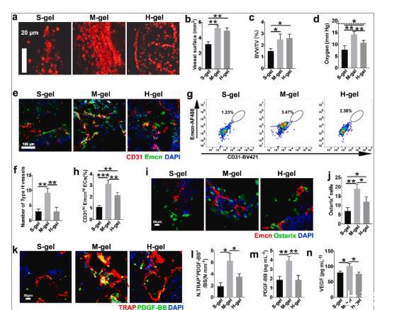 圖5、M-gel通過前破骨細胞促進血管生成和骨生成。(a)骨缺損血管造影的代表性圖像。(b)容器表面的量化(n=6)。(c)血管體積的相對定量(n=6)。(d)植入8周后,通過尖端直徑為100μm的微電極(Unisense,丹麥)測量骨缺損中的氧分壓張力(n=6)。虛線代表正常骨髓中的氧分壓。(e-f)CD31(綠色)、內粘蛋白(Emcn)和DAPI(藍色)的代表性免疫染色圖像和分析。具有CD31 hi Emcn hi(黃色)的細胞代表植入2周后的H型血管(n=6)。(g–h)流式細胞術圖和CD31 hi Emcn百分比分析hi內皮細胞(n=6)。(i–j)Emcn(紅色)、Osterix(綠色)和DAPI(藍色)的免疫染色。骨修復2周后對Osterix+細胞進行定量(n=6)。(k–l)用TRAP(紅色)、PDGF-BB(綠色)和DAPI(藍色)染色的免疫熒光圖像。植入2周后骨缺損骨表面PDGF-BB+和TRAP+細胞數量的定量(n=6)。(m)植入2周后骨缺損中的PDGF-BB水平和(n)VEGF水平(n=6)。